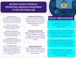 The rise of distilled open-source AI models and frontier reasoning LLMs positions itself as a two-pronged attack on the American AI curtain—exemplified by DeepSeek’s progression towards DeepSeek-v3, a mixture-of-experts (MoE) frontier LLM. While export controls on high-performance chips and closed-model weights remain vital towards AI security, adversaries and competitors are finding ways to work around rules set by the U.S.. DeepSeek focused on hardware compliance and software-centric strategies, using distillation from previous LLMs to fine-tune and repurpose open-source research. The circumventing of U.S. export controls, leveraging of software innovation, and changing policy stances on GPU manufacturers’ sale-controls all work together to lag policy responses to emerging foreign AI-development strategies. Implications for policy include:
